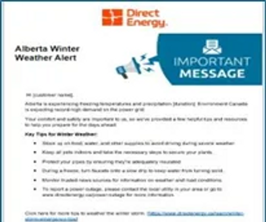 Objective: Support customer retention by sharing timely, helpful information. Customer Care wanted to notify customers about potential high demand on the power grid during extreme cold and offer tips to conserve energy while staying safe and warm.